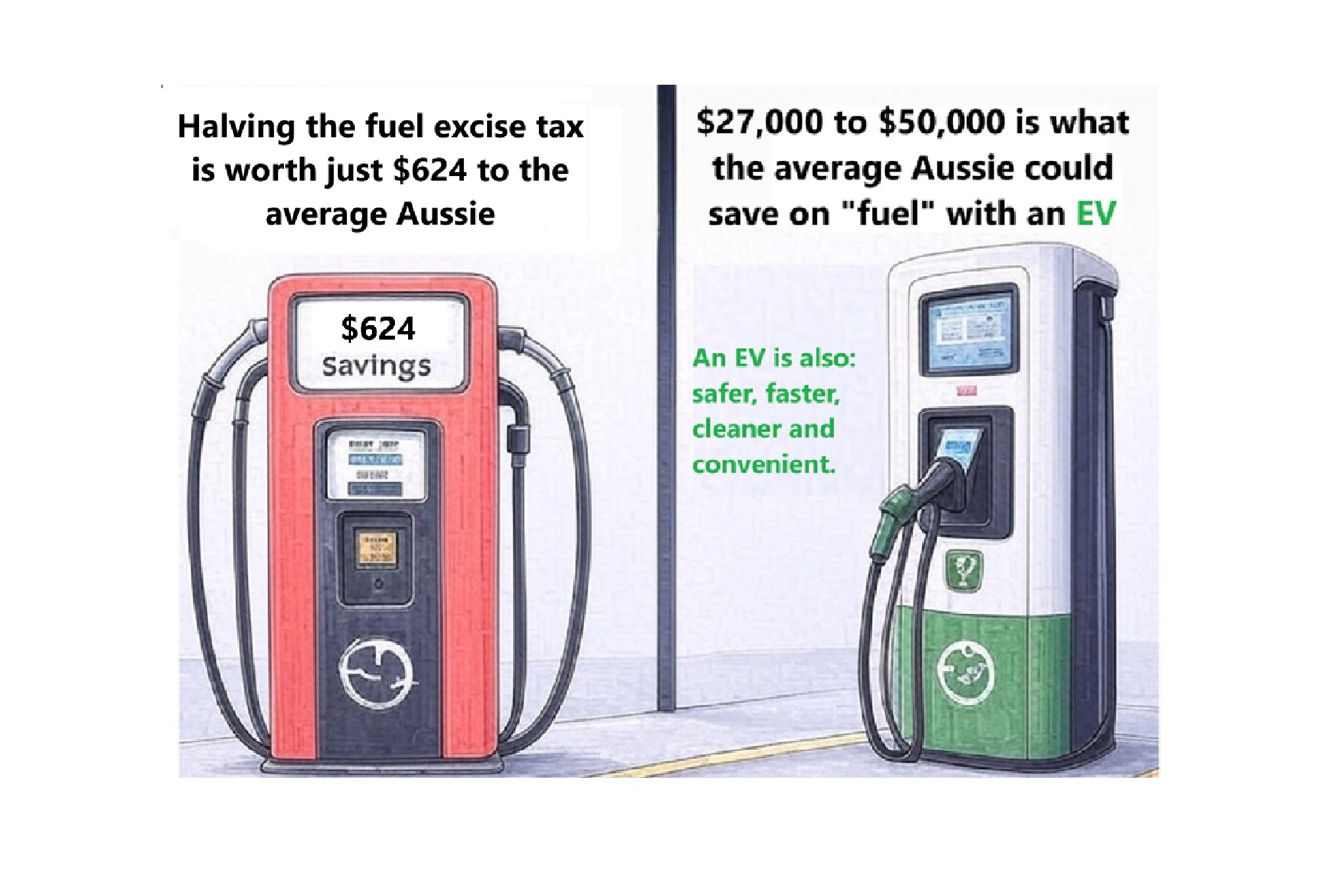 As you contemplate the halving of the fuel excise cut think beyond the pump. The choice isn’t just about a temporary 25-cent discount. It’s about whether you want to pocket $624 or unlock tens of thousands in savings with an EV. The numbers speak for themselves. Why settle for a once-off drop in the bucket when you could drive toward a future of massive ongoing savings?